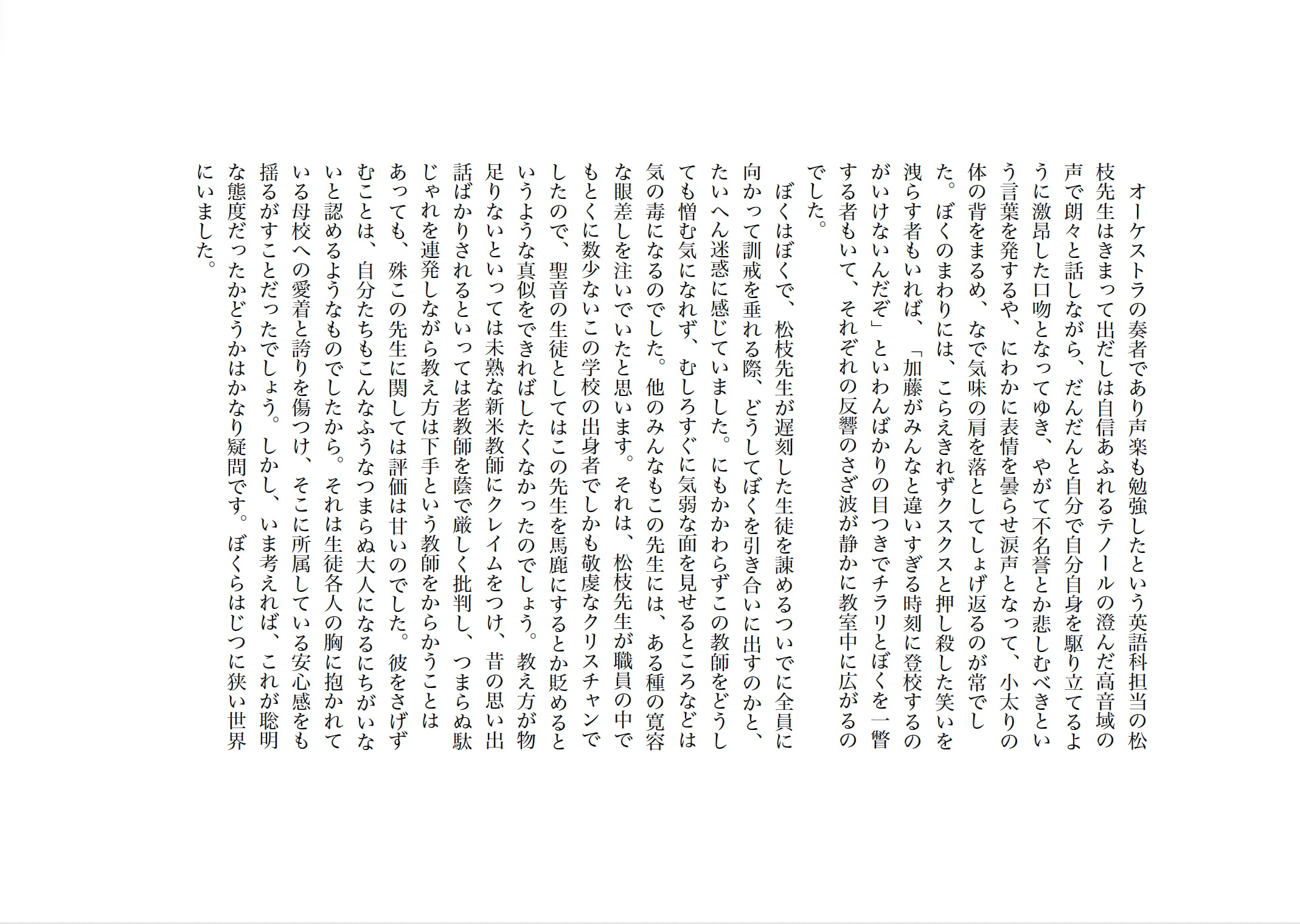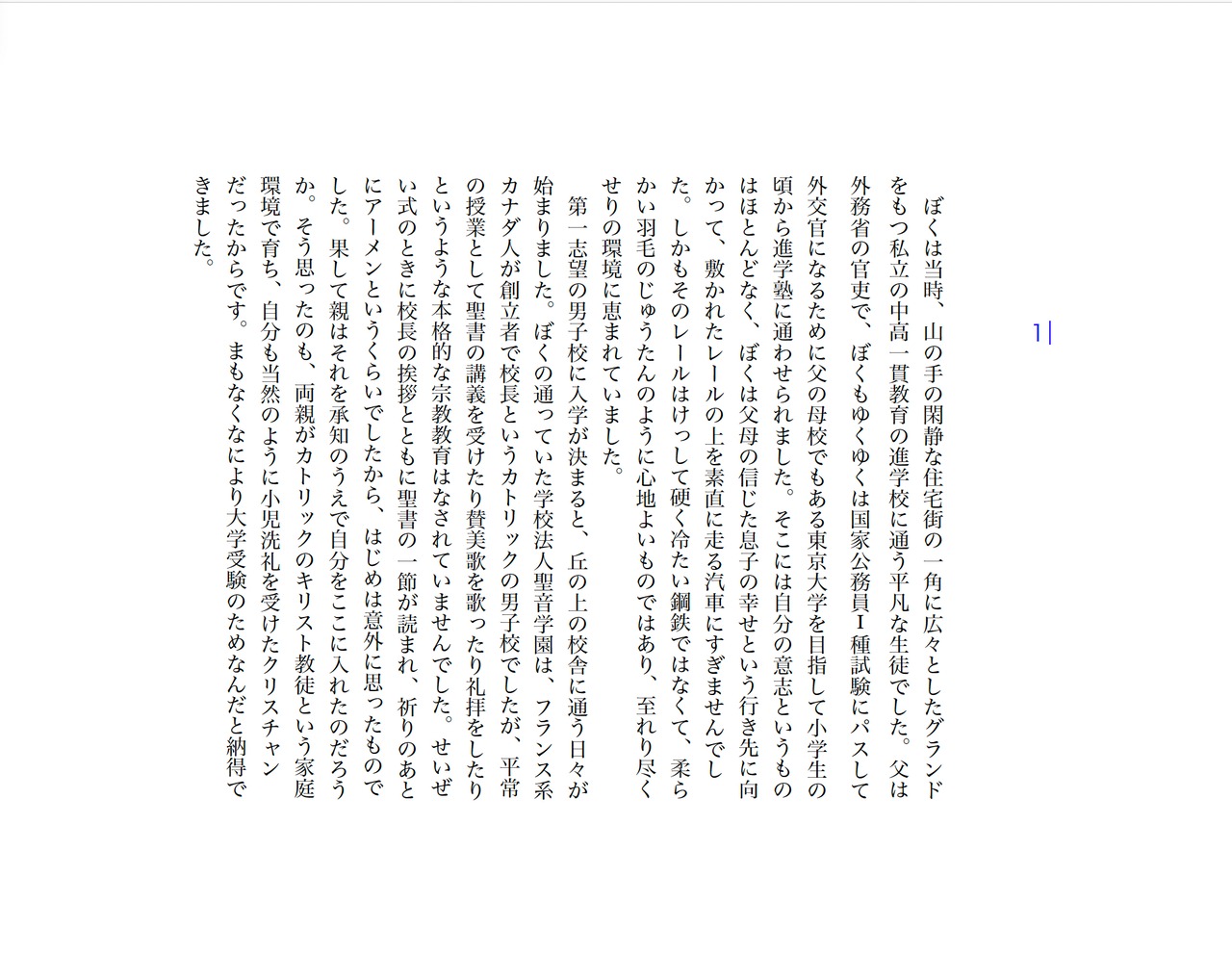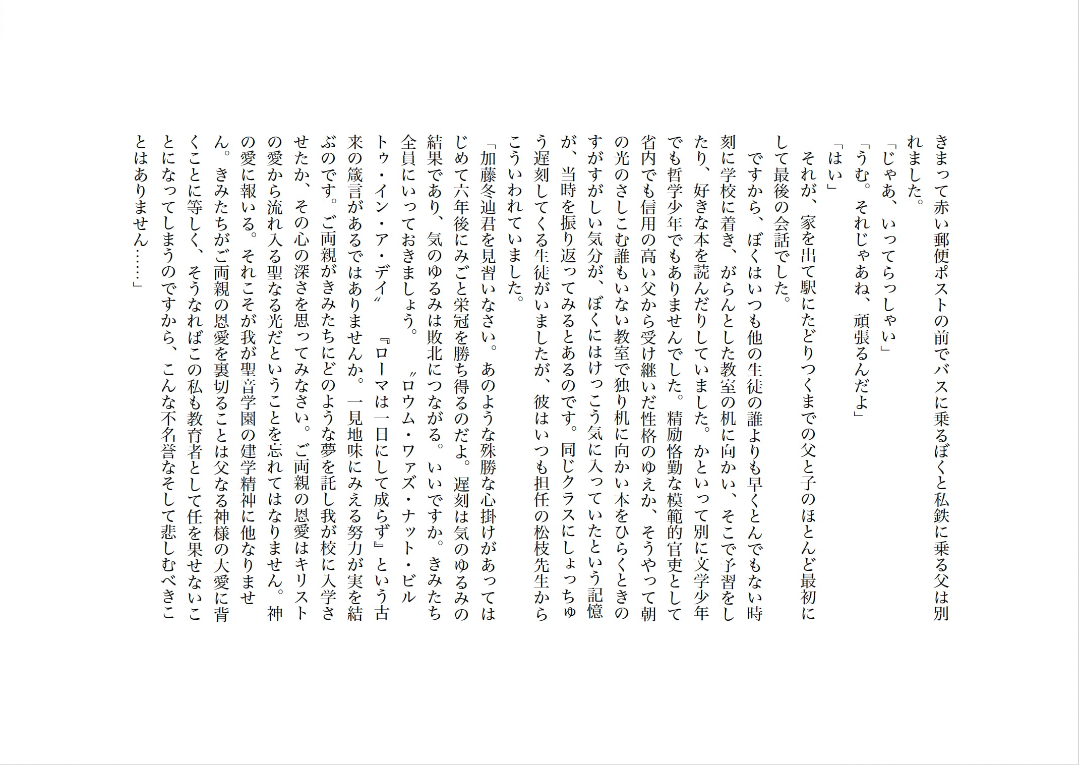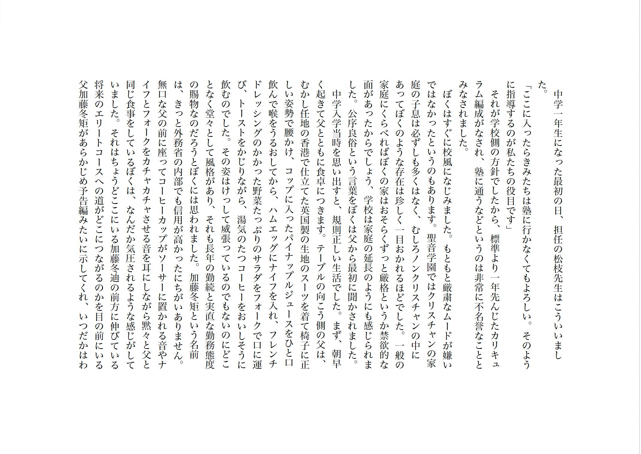 主人公の加藤冬廸(ふゆみち)は何ひとつ不自由のない恵まれた家庭環境に育ち、カトリック系の中高一貫の進学校に通っている。エリートの父と同じ道を歩むように親の敷いたレールの上で東大合格をめざして勉強にいそしむ毎日を送っていたが、あるときからそうした人生に疑問を抱くようになる。きっかけとなったのは、浦上和順という同級生だった。物静かだが、個性的な彼は強力な感化をおよぼしてきた。